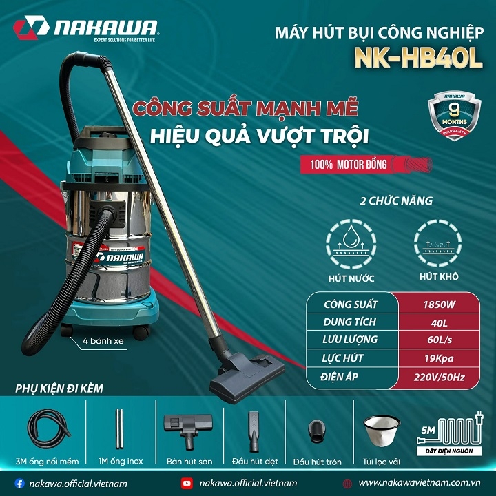 Máy hút bụi công nghiệp NAKAWA NK-HB40L có công suất lớn 1850W, lưu lượng 60L/s, cùng với dung tích thùng chứa bụi 40L giúp dọn sạch bụi bẩn hay vết nước một cách nhanh chóng.