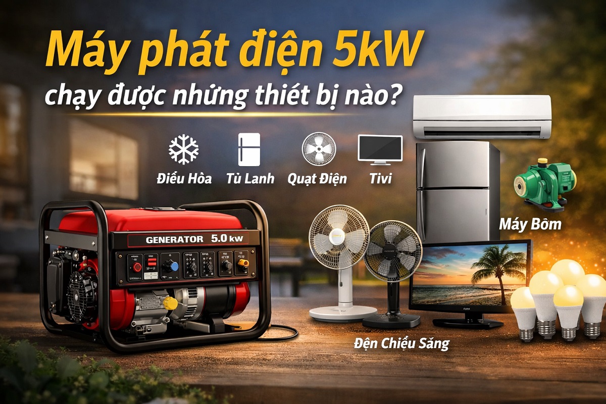 Máy phát điện 5kW là dòng máy được nhiều gia đình, cửa hàng và trang trại lựa chọn vì công suất vừa phải, giá thành hợp lý và đáp ứng được nhiều nhu cầu sử dụng khác nhau. Tuy nhiên nhiều người vẫn thắc mắc: máy phát điện 5kW chạy được những thiết bị nào?